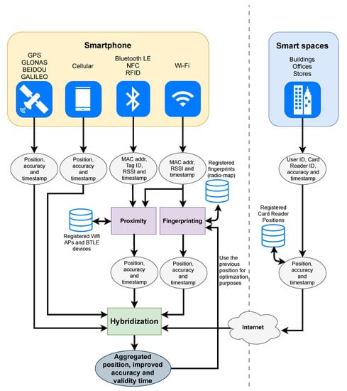 A collaborative/hybrid positioning approach has been designed on the basis of usual positioning sources (like cellular, GPS and wireless proximity) and some extra indoor positioning technologies and algorithms coming from smart spaces. This way, the most accurate location source will be chosen or a combination of them, improving the accuracy and availability of the system across different places. A graphical representation of how the main functions of the positioning system work is shown in Figure 1. Data retrieved from radio-frequency communication technologies coming from the same mobile device are combined with data received by smart infrastructures to compute the final position.