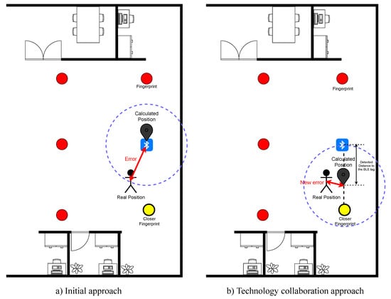Figure 2 shows a first case without combining technologies on the left. Here, the positioning system uses the Bluetooth beacon depicted in the figure to locate the person. The distance between the person and the beacon can be determined using the perceived signal strength. However, the positioning system is only able to figure out that the user is probably located at any point of the dashed blue circumference surrounding the beacon. As the mean position of all possibilities in a circumference is the middle point, the algorithm returns this location as result, with an accuracy/error equals to the calculated distance between the person and the beacon. In contrast, in the second case illustrated in Figure 2, due to the fact that Wi-Fi fingerprinting is integrated with Bluetooth proximity, in addition to the distance between the person and the beacon, the location of the nearest fingerprint can be used to choose a best estimate location within the circumference. Hence, as can be seen, the final error is greatly reduced. As we cannot know the exact value of this new error, the same accuracy/error blue circumference is also shown in Figure 2b, but centered in this case in the new approximated position. This assumption is valid if we have at least three surrounding fingerprints. This hybridization is just an example of the possibilities offered by the platform, which is open to new merging possibilities.