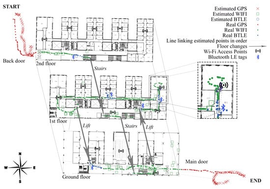 A summary of the error results for each technology is included in Table 1. From these results we can estate that the mean error of the system was m for our testbed involving a mix of technologies. It is important to remark the challenging scenario considered, where the GPS signal is partially disrupted by the metal-made building facade, increasing the overall error. These results could be further improved with a lower resolution grid for WiFi fingerprinting, deploying more Bluetooth LE tags and entering more spaces with a card reader available. Many rooms in the building provide such capability and we have also disabled many other Bluetooth LE tags in order to present a realistic and cost-efficient setup.
