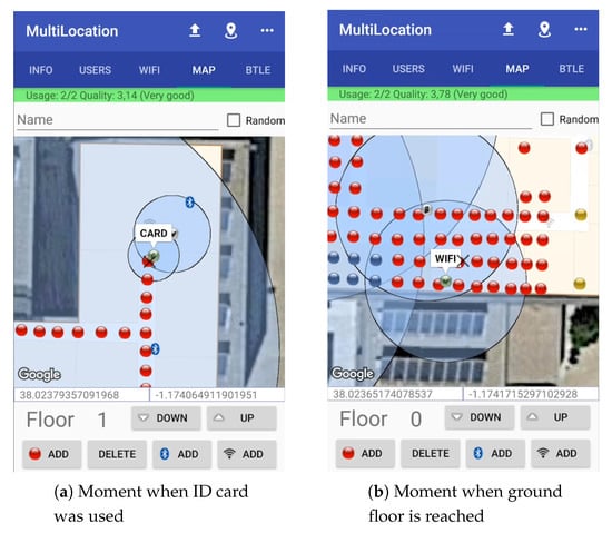 A real testbed was deployed at the Computer Science Faculty (University of Murcia). As can be seen in Figure 3, real plans of the building floors are used to show the main architectural components and one of the validation tests. Prior to the tests, 26 WiFi APs were registered with their positions (latitude and longitude), as well as their measured RSSI at 1 meter of distance using the smartphone app. In addition, five BLE tags were installed at strategic points. For the sake of clarity, these tags were depicted with the technology symbol, while WiFi APs were included as points surrounded by waves. Only some of the doors of the first floor of the building were provided with contact-less card readers; that supposes approximately 34 of them. However we only used one in the trials in order not to compromise workmates privacy. It is shown in purple in the map on the right of the first floor, as can better be seen in the zoomed part of the map. The door opening system of the building was prepared to send positions to the positioning system when the user was identified by the ID card readers.