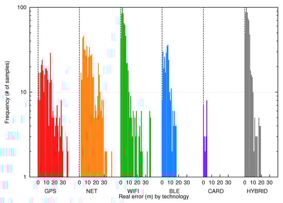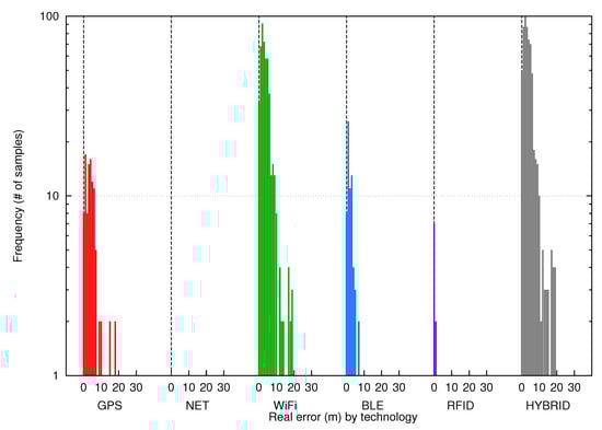 As can be seen in Figure 6, most of the calculated positions by the hybridization process had an error below 10 m, and a great part below 5 m. Most of the high-impact errors were due to GPS, since it was used near the building with a metal-made facade that reflected part of the satellite signals. However, there were some errors between 10 and 20 m that were attributed to WiFi fingerprinting, which presented deviations when the user moved near the floor edges. This was due to the bad distribution of fingerprints surrounding the user at these locations. Although accuracy was highly impacted by the wide usage of WiFi fingerprinting, overall results were improved by the small areas where Bluetooth LE proximity and ID card readers were used. Here the errors detected were usually below 5 m. The Android Network positioning source was not used, since the accuracy value obtained for this technology (based on cell ID and WiFi proximity) was worse than the accuracy estimations of the rest of technologies. This is the reason why in Figure 6 there are not values in the NET histogram.
