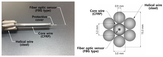 The dimensions of the Smart Strand are almost identical to those of a regular seven-wire strand [12] widely used in PSC structures, as shown in Figure 1. The steel core wire of the regular strand is replaced with carbon fiber reinforced polymer (CFRP) and a fiber optic sensor with several embedded FBGs, while the CFRP core wire is manufactured. The Smart Strand can also play the role of a structural component as a strand because the mechanical properties of the Smart Strand are similar to those of a regular strand in service. The Smart Strand has the following advantages in the measurement of PF when compared to a conventional technique where ERSGs are attached to helical wires of a strand: highly accurate and stable measurement, durability due to the protection provided by embedment, and the measurement of the actual axial strain of a strand. The reliability of the data obtained by Smart Strands was validated by the comparison with those of ERSGs in laboratory tests and a full-scale specimen [2]. If the scope is extended to relatively advanced techniques to measure the PF, other than ERSGs and those introduced in Section 1, the following attempts have been made: vibration and modal analysis [13], ultrasonic waves [14,15], acoustic emission and stress waves [16,17], elasto-magnetic (EM) sensors [18,19], vibrating strings [20], and FBGs encapsulated inside a strand or attached to the surface of a strand [21,22,23,24,25,26,27]. However, many of these methods suffer similar drawbacks to those mentioned earlier in Section 1: they were mainly applied only to laboratory test specimens and were not sufficiently validated through the field measurement of actual full-scale structures. Furthermore, they can only provide approximate and limited data of PF at a specific location. It is noted that a similar type of strand with the FBG-embedded steel core wire was developed in other studies [21,22] and efforts were made to apply this strand to actual structures. Although Shen et al. [27] criticized a type of Smart Strand [2,3,21,22] by mentioning the difficulty in positioning the FBGs at predetermined points and in connecting the fiber optic sensor to an optical cable for data logging, these aspects did not matter, at least in the Smart Strand developed in this study [2,3], according to the authors’ experience. That is, the position of the FBGs on fiber optic sensors can be easily traced by a proper marking technique when the CFRP core wire is manufactured through a pultrusion process and helical wires are assembled around the core wire. Besides, the connection of the fiber optic sensor to the optical cable does not involve much difficulty if the core wire is extruded in advance, as shown in Figure 1.