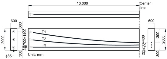Figure 3 shows the post-tensioned 20 m-long full-scale specimen which was fabricated to investigate the long-term characteristics of PF using Smart Strands. Three ducts denoted by T1, T2, and T3 in Figure 3 with different curvatures, including one straight duct of T3, were arranged and a total of 12 strands, each with a diameter of 15.2 mm and an ultimate tensile strength () of 1860 MPa, were inserted into each duct with a diameter of 85 mm. The strands in each duct were tensioned using a multi-strand jack up to at one end at a concrete age of 27 days when the concrete strength attained 30 MPa, which was considered in the calculation of . Then, all the ducts were grouted to bond the tendons. Three types of Smart Strand with three, five, and seven equally spaced FBGs, respectively, were fabricated and selectively inserted into each duct, together with regular strands. Figure 4 shows how the Smart Strands and regular strands were located in each anchor head, where the numbers indicate the number of FBGs.