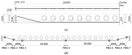 Figure 5 shows the PSC girder bridge with a 60 m span, where one Smart Strand was applied to one of the six ducts arranged in one of the 10 girders for long-term monitoring. The girders of this bridge incorporate a series of holes in the web, which can enhance the aesthetics and reduce the self-weight, and have multi-stage prestressing, with the secondary tendons anchored at the holes [40]. The Smart Strand had seven FBGs and was inserted into the duct, together with 11 regular strands, as shown in Figure 5d. Six FBGs were concentrated near both ends of the girder because a wide range of variation in PF was anticipated there, whereas the remaining one FBG was located at the mid-span that is practically important in safety assessment. The strands were tensioned up to at the concrete age of 1 month using a multi-strand jack at both ends, after which the ducts were grouted. The diameter and of the strands are the same as those used in the full-scale specimen and = 80 MPa.