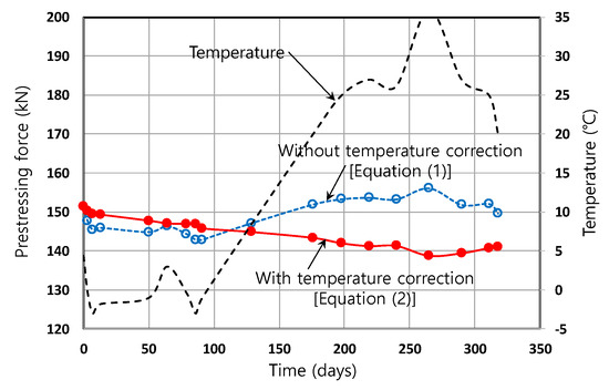 The PFs of the full-scale specimen and the PSC girder bridge were measured using Smart Strands for as long as possible, but the data measured for 318 days and 476 days after tensioning for the full-scale specimen and for the PSC girder bridge, respectively, were analyzed in this study. During the long-term measurement, the strains measured by sensors are affected by seasonal and daily temperature variations, and such temperature-dependent variation must be corrected or compensated for to derive the purely mechanical strain of interest that is directly related to stress. The correction can be accomplished by applying Equation (2) instead of Equation (1). Figure 6 compares the temporal PF variation before and after the temperature correction, which was measured in an FBG of a Smart Strand in the full-scale specimen. The temperatures were measured simultaneously when the wavelengths at FBGs were measured. The PF fluctuated in line with the trend of temperature variation without the correction, whereas consistent long-term prestress losses were obtained by applying the correction. Consequently, the following analyses are based on the temperature-corrected data. Abdel-Jaber and Glisic [9] also performed temperature compensation for the long-term strains obtained using FBGs. However, they did not rely on Equation (2), which was derived by taking the principles of FBGs into account, but simply applied a general temperature compensation procedure for concrete strain. This could be a potential problem due to the decreased accuracy of mechanical strain.