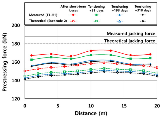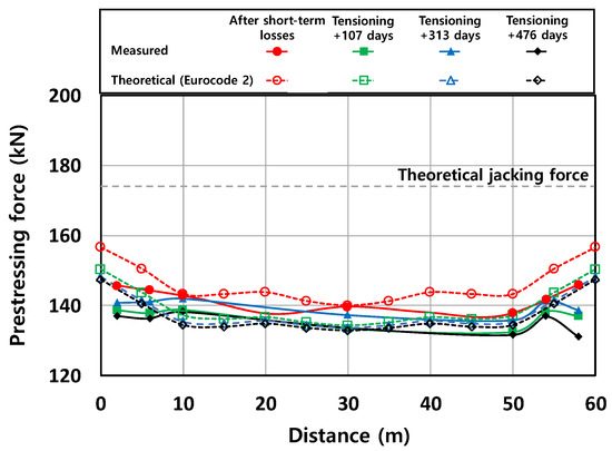 Similar to the full-scale specimen, the theoretical estimation obtained by Eurocode 2 [38] and the measurement of PF were compared in Figure 9 at a few different time points. The bullets in the measured PF indicate the locations of FBGs, whereas the theoretical values were produced at 5-m intervals. Because the actual PF of each strand was not measured using an EM sensor, only the theoretical jacking force is presented.