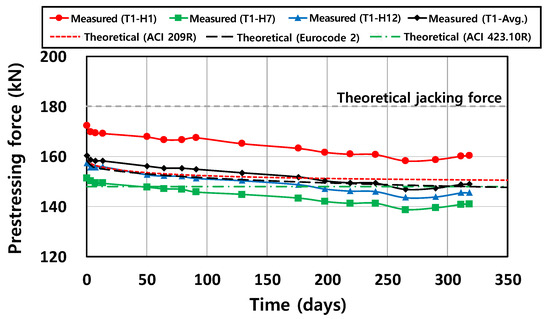 Figure 8 presents the PF variation at mid-span over time in both measurement and theory. H1, H7, and H12 of T1 in Figure 4 were representatively analyzed herein. Zero-day corresponds to the time after tensioning when the short-term losses had just occurred. The PFs measured at a specific time are different in three Smart Strands, including at the time of tensioning. This indicates that the PF of a strand can vary from strand to strand inside a duct due to the uneven interlocking between a strand and a wedge at the anchor head, although all the strands are tensioned simultaneously using a multi-strand jack. The PF variation of a strand in a duct was statistically analyzed by Cho et al. [19] Therefore, the averaged value of the PFs in the three Smart Strands was also provided in Figure 8 to reduce any bias.