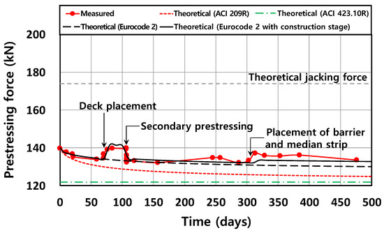 It is apparent that the PFs were decreased over time by the long-term losses of prestress in both measurement and theory. Although the two approaches gave a similar decreasing trend, the decrement in each time step varied between the two, as shown in Figure 7 and Table 1. However, the total long-term losses, until 318 days after tensioning, are very comparable at 7.0% and 6.3% of the jacking force in measurement and theory, respectively, at the mid-span. Therefore, Eurocode 2 [38] made a reasonable estimation of the long-term prestress losses, as will be confirmed again by comparing with other provisions in Figure 8.
