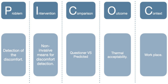 In the given study, the research question is focused on indoor thermal discomfort detection by non-invasive means in the workplace. The problem intervention comparison outcome context (PICOC) framework is used to define the main points of the meta-analysis. As presented in Figure 1, the “problem” section describes the key question for investigation, or in other words, “What is the problem that we are trying to solve?” For the purpose of given SLR, “problem” can be described as the “detection of thermal discomfort”. “Intervention” explains ways for solving the above-mentioned problem, and, for given study, this is the “non-invasive means for discomfort detection”. The “comparison” section should provide ways through which it is possible to quantify and evaluate how the system was functioning before and after the intervention. As was discussed in the previous section, it is common practice to evaluate thermal comfort prediction accuracy by implementing surveys among people. Such an approach is going to also be considered for the “comparison” section of the PICOC. The “outcome” describes the desired result from the intervention, which is a comfortable temperature for the given case. The last section is the “context” that defines the boundaries of the problem. The boundary for SLR was defined as a workplace.