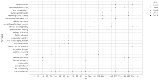 Only 25 articles out of total 35 contained keywords which were repeated at least once among papers. The most popular keyword was “thermal comfort”, used in 12 articles (see Figure 2). Some less popular but still repeated keywords were “infrared thermography” (four times), “machine learning” (three times), “skin temperature” (three times) and “thermal sensation” (three times).
