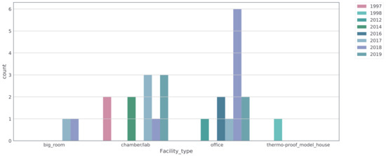 According to the analysis, the first article that investigated possibility of determining thermal comfort by non-invasive means was published in 1997 by Yousuke Taniguchi and Hiroshi Aoki. They used a chamber to control the experimental environment and an infrared camera to determine the skin temperature of the person [29]. Further studies showed interest in using an office environment or regular room in addition to a laboratory or thermal chamber (see Figure 3).