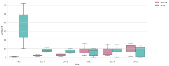 The majority of studies held during 2014–2019 had no more than 20 male and 20 female participants (see Figure 4).