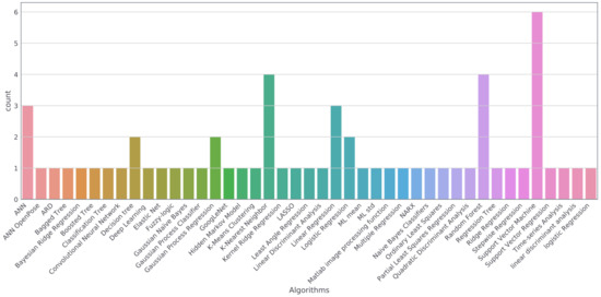 Frequency counts for algorithms used in different studies for non-invasive thermal discomfort detection are presented in Figure 5. The majority of the algorithms do not repeat among studies. In total, 43 different algorithms were implemented, and only eight of them were used in more than one study. The leading approach with respect to the amount of times used is the support vector machines (SVM), which appeared six times among studies [31,38,42,43,53,55]. Random forest and k-nearest neighbor (k-NN) appeared four times [31,35,39,53]. Additionally, ANN was used three times [29,43,56], just like linear regression [49,51,57]. Decision trees, Gaussian process regression and logistic regression were used two times [37,54].