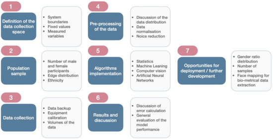 General data utilization flow is shown at Figure 7. It illustrates the broad nature of variables and components used for predicting thermal discomfort via machine learning algorithms, artificial neural network and statistics. The section dedicated to the bio-metrical data covers all data related to participants’ biological parameters. This type of data should be handled in a strict way, since the combination of bio-metrical variables can destroy the anonymity of data sampling within a study. Due to given circumstances, the protocol for data collection should be developed with sections that have detailed descriptions of the data protection, encryption and sample ID generation. Such strict rules may be one of the reasons why “Skin Temperature” and “Pulse” were the most commonly used variables among processed studies (see Table 4). For example, “BMI” in combination with “height” can provide private information about a person’s lifestyle and general appearance which can compromise the results of the study. Given circumstances create additional milestones within bio-metric data collection, especially in cases where certain facial mapping data collection is involved.
