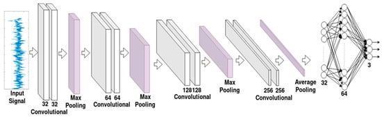 where weight is the vector and is the bias term of the kth filter of the lth layer. In the first layer, l = 1 and . The kernel generates the feature map as shown in [50,51,52]. The second convolutional operation is applied to the output of the first layer. Unlike multi-layer networks, the activation function is used for non-linear transformation of signals of CNN to detect non-linear features. For this aim, the non-linear activation function is applied for the transformation of (1).