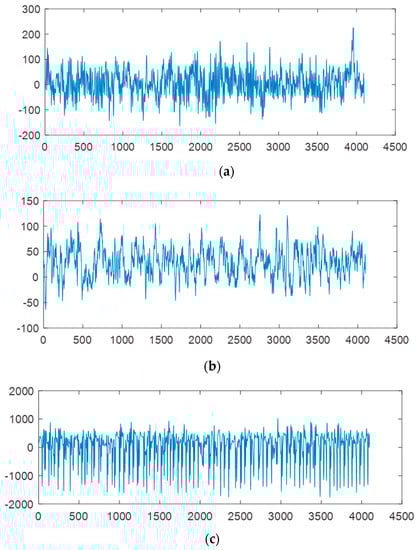 The CNN described above is utilized for epileptic seizure detection. We explored the Bonn University (BU) EEG database [18] and the CHB-MIT scalp EEG database [26] in this research. The first data were downloaded from the BU EEG database [18]. The BU data were obtained from five patients and each dataset comprises 100 EEG signals. Every signal is captured within 23.6 s. In the simulations, EEG signals are generated using the same 128 channel amplifier. The data is digitized at a resolution of 12 bits and of 173.6 samples per second. The acquisition system has a bandwidth of 0.5 Hz to 85 Hz. Every dataset has 4096 (23.5 × 173.6) sampling points for 23.5 s. The total number of EEG signals used in the simulation is 300; 100 normal signals (Set B), 100 preictal (Set D) and 100 seizures (Set E). After visual inspections, the signals are obtained from multichannel encephalogram recordings. The normal data set includes EEG signals obtained from five healthy instances, each of which contains 100 cases. The preictal file consists of 100 data obtained from five individuals with epilepsy who did not have epilepsy at the time of measurement. Similarly, the seizure class comprised 100 instances with the same subjects who had epilepsy at the time of data acquisition. Figure 2a–c depicts seizure, preictal and normal samples of EEG signals. As shown, EEG signals are high order non-linear and non-stationary signals that have a very complex structure. For the classification of such signals, the researchers try to extract basic distinguishing features and use these features for classification purposes. Analysis of the signals can sometimes be difficult. These processes are tedious and time-consuming. Hence, the accurate and fast identification of these signals is important. In this paper, a CNN is developed for the classification of EEG signals.