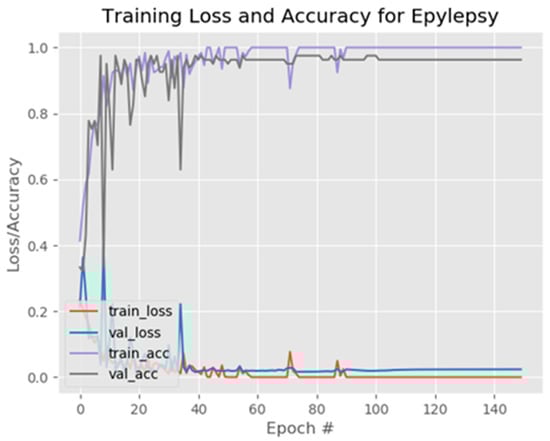 The CNN was trained using 150 epochs. Figure 3 depicts the simulation results of loss function and accuracy. Table 2 depicts the simulation results of the CNN. During training, the value obtained for the loss function was 3.8277 × 10−11. The value of the loss function obtained for validation data was 0.0237, and that for the test data was 0.013878. For the test data, the accuracy was 96.67%, specificity was 98.33%, and sensitivity was 96.67%.