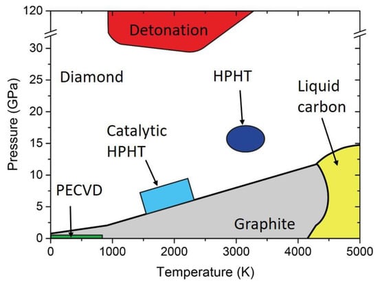 It is well known that the stable allotrope of carbon at ambient pressure and room temperature is graphite. As can be seen in the carbon phase diagram of Figure 1, diamond requires extreme conditions of temperature and pressure to be formed. For instance, natural diamond may be formed in the Earth’s mantle, 140−200 km below the surface [26], where the temperature and pressure are in the range of 900−1400 °C and 4.5−6 GPa, respectively [27]. Once the diamond phase is formed, the transition back to graphite at ambient conditions is avoided by the high energy barrier for phase transition. Indeed, even if graphite is thermodynamically favored (energy difference of 0.02 eV per atom between diamond and graphite), a 0.4 eV energy barrier must be overcome to move from sp2 to sp3 chemical bonds. This makes diamond a metastable phase, as it is thermodynamically unstable, but the transition kinetics to graphite is prohibitive. Currently, many different methods for artificial synthesis of NDs are available [1]. In the following sections, the three main techniques commercially available are described: detonation, chemical vapor deposition (CVD), and milling of high-pressure, high-temperature (HPHT) micro-sized diamonds.