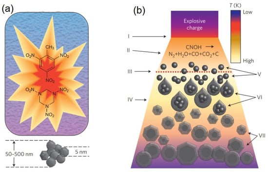 (a) Detonation process. A mixture of 60% TNT (C6H2(NO2)CH3) and 40% hexogen (C3H6N6O6) is detonated inside a metallic chamber filled either with water (liquid or ice) or gas (an atmosphere of N2, Ar, or CO2). Then, 4–5 nm sized nanodiamonds (NDs) agglomerated into sub-micrometer clusters are obtained. (b) Schematics of NDs synthesis upon shock wave propagation. The detonation (I) leads to chemical dissociation of the carbon precursor (II), which can be the explosive molecules or graphite. The dashed line (III) represents the region where the pressure required to form the diamond phase is reached. The detonation products expand (IV), and the carbon atoms condense and crystallize (V) to form nanoclusters (VI). Finally, NDs crystallize, starting from carbon nanoclusters, grow, and agglomerate (VII). Reproduced with permission from [1], Springer, 2012.