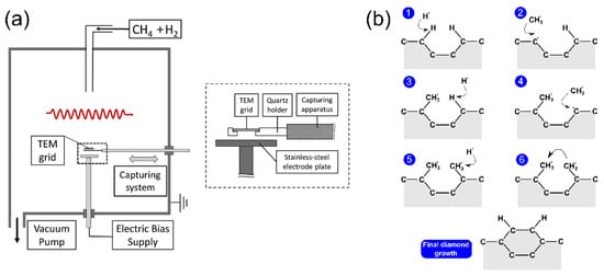A weak concentration of CH4 produces microcrystalline diamonds, whereas a high value of the CH4/H2 ratio decreases grain size to the order of tens of nanometers for 1−5% CH4/H2. The standard diamond growth mechanism [35] is schematized in Figure 3b. Carbon atoms at the surface of diamond seeds are left with dangling bonds after hydrogen abstraction by H• radicals. These bonds are then filled by CH3• molecules. When this process takes place in two adjacent sites, the new carbons can bond together, and finally be locked into the diamond lattice.