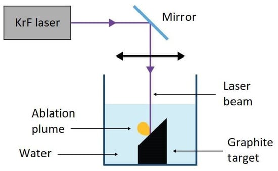 Starting from the pioneering work of Yang et al. [38], PLA has become a viable method for the synthesis of NDs. A standard PLA experimental setup for NDs is given in Figure 4. The laser beam is focused on the top surface of a graphite target that is immersed in a liquid, which is typically water, but NDs production has been observed in other liquid environments, such as cyclohehexane [39]. A pulsed laser is used in order to release an extremely high power on the target; usually, laser pulses in the ns region with energies in the order of 100 mJ, for a final power density of up to GW cm−2, are employed.