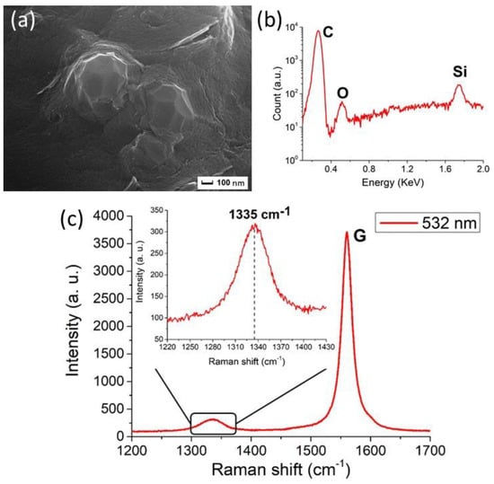 Characterization of the NDs from graphite ablation in water. (a) Typical Scanning Electron Microscopy (SEM) image, after removal of the non-diamond phase of carbon, showing clustered nanoparticles of about 100 nm size. (b) Energy-dispersive X-ray Spectroscopy (EDXS) spectrum of the nanoparticles. The carbon peak is detected at 0.27 keV. Moreover, the peaks of silicon at 1.74 keV and of oxygen at 0.52 keV are observed. They come from the substrate on which the particles are deposited and from the oxidized surface layers of the ablated powders, respectively. (c) Raman spectrum (obtained under 532 nm excitation wavelength) of purified particles. The main peak at 1580 cm−1 is the graphite G peak, while the peak at 1335 cm−1 (shown in detail in the inset) is attributed to compressively-strained NDs. Reproduced with permission from [40], Springer, 2018.
