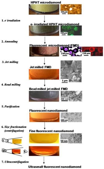 Despite that, the standard way to produce NV-centers-enriched NDs is a complex, multi-step, and expensive process. Synthetic HPHT diamonds typically contain 100 ppm of nitrogen atoms as an impurity in the diamond structure [58] and to form NV centers, vacancies are created in the lattice by high-energy particle irradiation (electrons, protons, He+) followed by a vacuum annealing at 700–1000 °C [59]. The role of the annealing is to increase the mobility of the nitrogen atoms inside the lattice, which are then trapped by the carbon vacancies to form NVs. One could directly irradiate NDs to increase the NV-fluorescence, but it has been proven by density functional theory [60] and Monte Carlo simulations [61] that NV concentration increases non-linearly with crystal size. In particular, the probability of forming NV centers in 5 nm sized NDs is 4.5 and 25 times lower compared to 20 and 55 nm NDs, respectively [61]. Thus, it is more efficient to increase NV concentration in micro-sized diamonds and then reduce their size to obtain fluorescent NDs. This was done by Boudou et al. [23], in what has become the standard fluorescent NDs synthesis technique. The procedure is shown in Figure 6. The starting material is HPHT-synthesized microdiamonds that are then irradiated with a 10 MeV electron beam to form vacancies. The following step is annealing at 750 °C to form fluorescent microdiamonds. The next step is the reduction of diamond size, achieved by nitrogen jet milling and ball milling to obtain NDs with a crystal size smaller than 10 nm. For bioimaging, which is the main field of application for fluorescent NDs, the number of NV centers should be as high as possible. For this reason, only HPHT diamonds that contain a relevant amount of nitrogen impurities are used. In contrast, CVD diamond films contain a very small number of nitrogen atoms [62]. Consequently, highly fluorescent NDs are not produced by this mechanism; rather CVD is used to produce nanocrystalline diamond films with single NV centers, suitable for quantum information technologies.