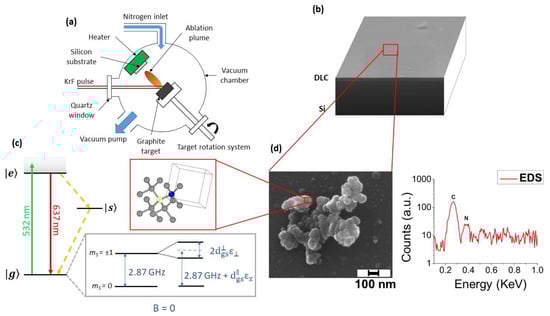 PLA has been demonstrated to be a promising process for the direct synthesis of NV-enriched NDs. Narayan et al. [63] achieved synthesis of NV-doped diamond in the form of single-crystal nanodiamonds, nanoneedles, microneedles, and thin films by pulsed laser irradiation of N-doped carbon film. Diamond phase formation is obtained through conversion of the sp2 carbon atoms through rapid melting in a super undercooled state and consequent quenching at ambient temperatures and pressures in air. Recently, we demonstrated direct synthesis of NV-centers-enriched NDs through the PLA of graphite in two different nitrogen-containing media: controlled nitrogen atmosphere [64] and liquid nitrogen [65]. In the first case, graphite is laser ablated inside a vacuum chamber filled with 1 Pa of nitrogen gas, and the ablated material deposits onto a silicon substrate. The resulting sample is a diamond-like carbon (DLC) film embedded with the fluorescent NDs (Figure 7).
