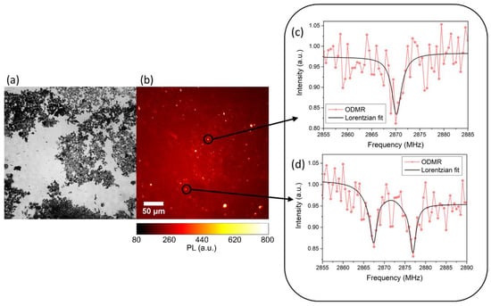 (a) Wide field optical image and (b) relative photoluminescence (PL) image. (c,d) Typical ODMR spectra obtained from the bright spot of (b), confirming the Nitrogen-Vacancy (NV) origin of the collected PL. The intensity reduction at 2.87 GHz is evident in (c), while in (d) a double resonance is observed due to strain of the NDs hosting the NV centers and removing the degeneracy of the ms = ±1 states. Reproduced with permission from [65], Elsevier, 2019.