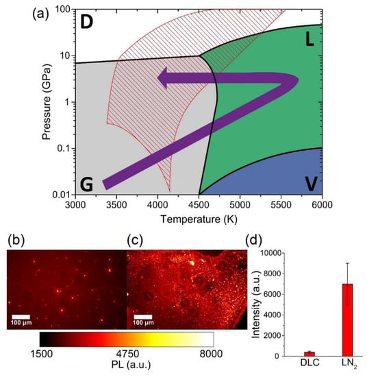 The mechanism responsible for ND formation is the same reported in Section 2.4. The whole graphite–liquid–diamond transition is represented by the purple arrow in the carbon phase diagram [41] in Figure 9a. The tilted red lines indicate the region where undercooled liquid carbon and metastable diamond coexist, referred to as a “diamond-like” liquid [66]. The transition to diamond phase occurs because in this thermodynamic condition, the energy barrier for diamond formation is lower than that for graphite formation [67]. It is important to note the presence of atomic nitrogen, which is required for NV-centers formation. The energy of the atoms, ions (from C+ to C4+), and electrons leaving the laser ablated target can be higher than 100 eV for the typical laser fluence used [68]. This energy is enough to break the N2 molecules, having a bond dissociation energy at room temperature of 9.79 eV. Thus, the ablated energetic species can easily break N2 molecules, and single N atoms may be trapped inside the nanodroplets expelled from the graphite target. Interestingly, we performed a comparison between these two methods (ablation of graphite in gas and liquid nitrogen) in term of the total PL emission of the produced sample (Figure 9b,c).