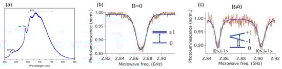 (a) Photoluminescence spectrum of an ensemble of NV centers under 532 nm laser pumping. The NV0 (575 nm) and NV− (638 nm) zero phonon lines are indicated. The red phonon sideband (PSB) is evident. (b) Continuous wave optically-detected magnetic resonance (CW-ODMR) spectrum of NV centers at zero magnetic field (b) recorded using the optically detected magnetic resonance technique. (c) CW-ODMR with an external magnetic field B ≠ 0, where the degeneracy of the ms = ±1 states is removed, thus leading to two different optical transitions split by the Zeeman factor 2γB, with γ being the electron gyromagnetic ratio. Panels (b,c) adapted from [81].