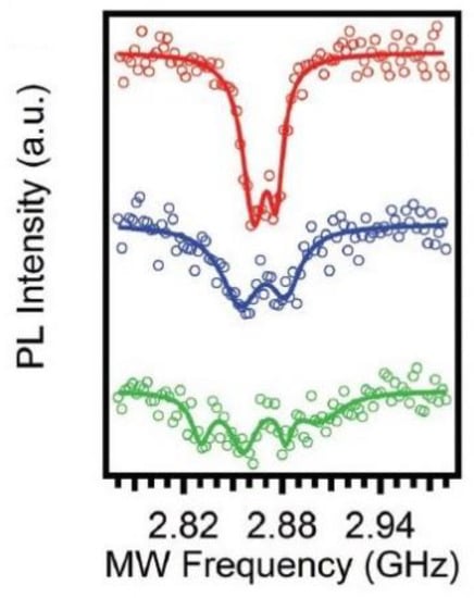 ODMR spectra under external magnetic field: zero-field (red curve), 1 mT (blue curve), and 3 mT (green curve). The circles are the experimental data while the lines are multi-gaussian fits. Adapted with permission from [82], Royal Society of Chemistry, 2016.