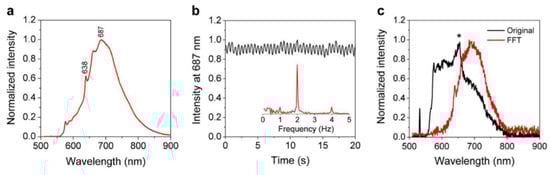 (a) Fluorescence spectrum of NDs in water under 532 nm Continuous-Wave (CW)-laser pumping. (b) Temporal evolution of the fluorescence intensity at 687 nm under 2 Hz magnetic modulation. The inset shows Fourier transformed frequency spectrum. (c) Normalized fluorescence spectrum of NDs in water (black) and its Fast Fourier Transform (FFT) spectrum (red) after demodulation (NDs concentration in water 0.1 μg mL−1). The asterisk indicates Raman peaks of water. Reproduced with permission from [85], Springer, 2017.
