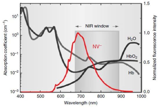 The cutting edge of research in the field of opto-magnetic imaging of NDs is represented in the work by the authors of [86], who successfully monitored the position of fluorescent NDs by using them as beacons for the early diagnosis/imaging of tumors via their positioning inside biological tissues. The NV− center is suitable for intra-tissue imaging because it emits fluorescence in the near-infrared. Nearly 70% of its light emission lies in the near-infrared (NIR) window from 650 to 1350 nm (Figure 13) [87], where light has the maximum penetration depth in biological tissue [88].