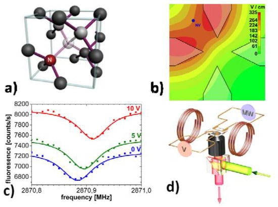 (a) Schematic drawing of the NV center; (b) simulated electric field 6 µm below the microstructure (where the NV is located) for 1 V voltage applied; (c) observed shift of the ODMR resonance lines for different voltages applied; (d) schematic of the used confocal setup with Helmholtz coils for magnetic field alignment. Reprinted with permission from [10], Springer, 2011.