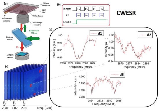 Spatially resolved OMDR wide-field imaging and strain-field dependence. Panel (a): Schematics of the inverted wide-field ODMR microscope. The green laser is steered onto the sample and focused through the 40× objective through a dichroic mirror transmitting the red photoluminescence. The RF irradiation is obtained with an Au-coated copper loop, here represented by the microwave antenna wire located under the sample’s surface. Panel (b): Temporal diagram of the continuous wave electron spin resonance experiment. The camera detects the PL image synchronously with the RF irradiation, and the laser is kept ON all along the measurement time. Panel (c) Photoluminescence images as the RF frequency sweeps in the 2.85–2.90 GHz range. An ROI (red square) containing a bright spot was selected and the average intensity inside that ROI was plotted as a function of the RF frequency to generate an ODMR spectrum. Panel (d) reports three typical examples of signals on diamond nano-agglomerates showing different strain effects (curves d1, d2, and d3). Reproduced with permission from [64], Royal Society of Chemistry, 2018.