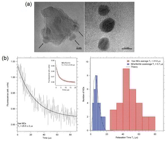 (a) High resolution Transmission Electron Microscopy (TEM) of ferritin molecules (right) showing the iron-containing core and a single ND covered with ferritin (left). (b) The spin relaxation time T1 of naked NV (left) and in ferritin-coated NDs (left, inset). Statistical distribution of the T1 for bare NDs (right, blue bars) and for ferritin-coated NDs (right, red bars). Reprinted with permission from [111], American Chemical Society, 2013.