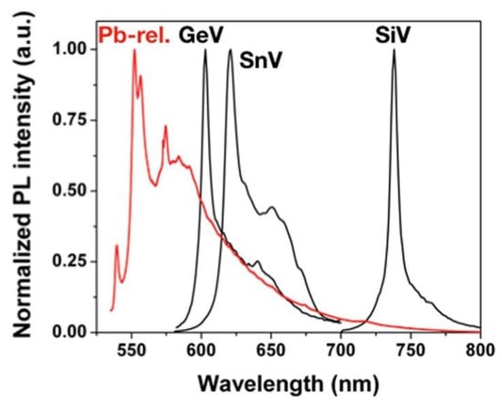 Fluorescence spectra of color centers in diamonds under 532 nm laser excitation. Lead-related (Pb-rel), germanium-vacancy (GeV), tin-vacancy (SnV), and silicon-vacancy (SiV). Reproduced with permission from [113], Springer, 2013.