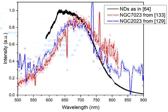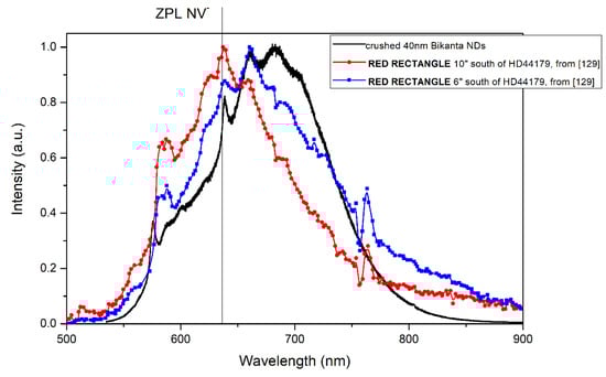 There has also been evidence that NV centers in NDs could be at the very origin of a long-lasting, puzzling, visible (red) emission observed in particular classes of nebulae, in particular, carbon-rich planetary nebulae. This is the so-called extended red emission (ERE) that has been a literature topic since the 1980s [128,129,130]. In Figure 20 we report the spectrum of the extended red emission (ERE) from the so called red rectangle (right panel), from [129], collected at different observation angles and compared with a typical spectrum of crushed CVD NDs with an average tail ≈40 nm. As can be seen, the ERE emission from the red rectangle (which is 25 times more intense than the other ERE nebular emissions, probably explaining why in all other lower signal strength spectra, they have not been resolved) is compatible with the photoluminescence spectrum of commercial uncoated Bikanta [131] 40 nm-tailed NDs, if the VIS (532 nm) pumping redshift with respect to far-UV pumping is taken into account, as was done in [131]. In particular, it is evident how the zero-phonon-line (ZPL) of the NV− emission is present both in the ERE as well as in the crushed commercial NDs, thus suggesting a significant VIS pumping versus the far-UV pumping of the NDs causing the ERE emission from the red rectangle [128,132].