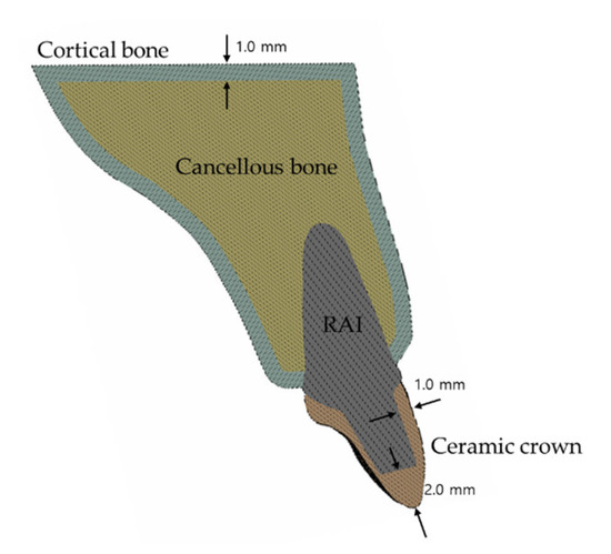 Finite element analysis (FEA) has become an effective method to evaluate peri-implant bone stresses and the relative micro-displacement between bone-to-implant interfaces under certain loading conditions [21]. However, most previous FEA studies on RAIs were limited in the analysis of the initial stability, which is one of the most important factors for the success of implant placement; they assumed the contact condition between the bone and implant was fully bonded and in a completely osseo-integrated state [19,22].