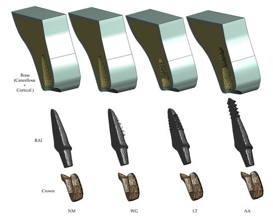 According to the micro-displacement results of this study (Figure 10 and Figure 11), the addition of more modification shapes (LT group), more penetration of the tooth socket or RAI root surface, or intentionally lengthening the RAI by adding apex-anchorage (AA group) may have a positive effect on the reduction of RAI micro-motions. Considering the results of our numerical analysis, the AA design may minimize the stress burden on the cortical bone, avoid overload on the cancellous bone, and cause the least micro-motion.