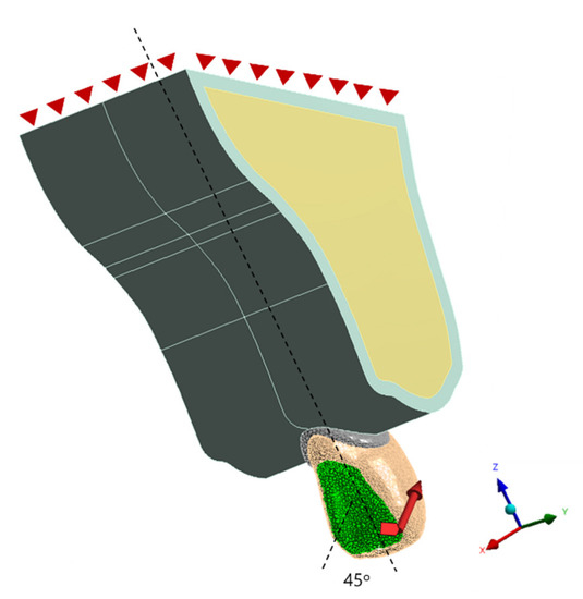 In this study, the geometry of the maxillary bone where the boundary condition was applied and the geometry of the crown where the mastication load was applied were identical in all four experimental groups. Therefore, for all four experimental groups, the bottom surface of the maxillary bone was taken as the fixed support, and, to simulate natural chewing loads on the palatal surface of the maxillary central incisors, according to the previous finite element analysis studies on similar topics [4,25], a static load of 100 N was distributed to the palatal surface of the esthetic ceramic crown at a 45° angle to the tooth extraction socket long axis (Figure 4). The interface between RAIs and crowns, together with the interface between cancellous and cortical bones are considered bonded in which neither separation nor sliding is allowed.