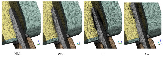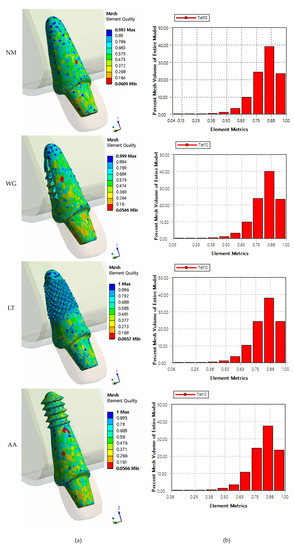 After model construction, all models were transferred to FEA software ANSYS 18® (ANSYS Inc., Canonsburg, PA, USA). Then, all models were meshed using tetrahedral elements with a lower limit of 0.02 mm in size was assigned (Figure 5). To check the quality of generated mesh [28], inspections for quality of elements were conducted after mesh generation (Figure 6). Whole mesh generations and finite element analysis was performed using a 64-bit version of Windows 10 and an Intel i9-990K processor with 64 gigabytes of random-access memory. The number of elements and nodes of each experimental group is described in Table 2. After the finite element analysis was completed, the contact statuses between the components constituting the model were checked (Figure 7).