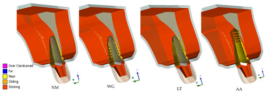Sectional view of contact status of each experimental group after finite element analysis (FEA) completed.