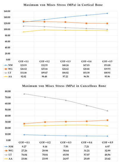 Figure 8 presents the maximum von Mises stress values (in MPa) on the supporting cortical and cancellous bones in all experimental groups according to the frictional coefficient (COF) values. In cortical bone, the NM group exhibited the highest von Mises stress values according to all COF values, whereas the AA group exhibited the lowest von Mises stress values according to lower COF values. In cancellous bone, the NM group exhibited the lowest von Mises stress values according to all COF values, whereas the LT group exhibited the highest von Mises stress values according to all COF values. Notably, as the COF was lowered, the maximum von Mises stress on cancellous bone in the LT group tended to significantly increase when compared to the other experimental groups.