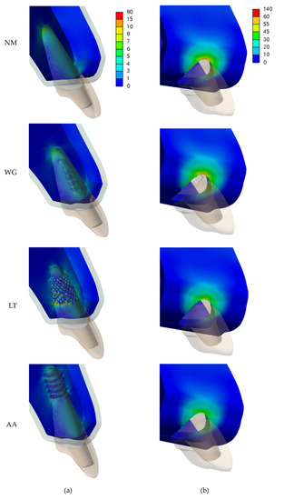 Figure 9 shows the stress distribution patterns on cortical and cancellous bone in all experimental groups according to the lowest COF values (COF = 0.1). In cortical bone, the maximum von Mises stresses were concentrated across the labial side of the bone in all experimental groups and according to all COF values. In cancellous bone, most stresses were concentrated in the cervical region adjacent to cortical bones in the NM study group. However, in the other study groups (WG, LT, and AA), most stresses were concentrated where the RAI penetrated the original tooth socket wall. In particular, in the LT group, the concentration of stresses was greater in the penetration site than in the cervical area, showing a different stress distribution pattern on cancellous bone than in the other study groups.