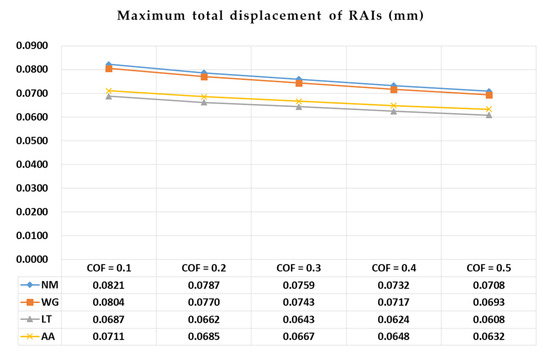 Figure 10 shows the micro-displacement of RAIs in each experimental group according to the COF values. In all study groups, there was a tendency for displacement to decrease with increasing COF values. The displacement values of the NM and WG groups were similar, as were those of the LT and AA groups. However, the values of the LT and AA groups showed significantly lower displacements than those of the NM and WG groups according to all COF values.