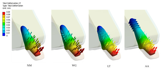 Figure 11 depicts the micro-displacement patterns of the RAIs in all experimental groups according to the lowest COF values (COF = 0.1) with directional vectors. In all study groups, regardless of RAI modification design, more micro-motions at the head of the implant occurred to the labial direction with the apical root of the implant as the center of rotation.