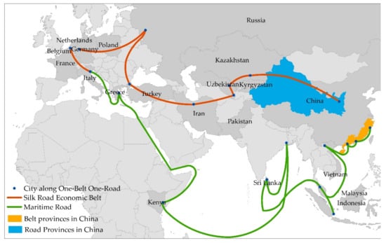 In September 2013, President Xi of China proposed building the Silk Road Economic Belt to boost regional cooperation and called for the establishment of a new regional cooperation model. These proposals are collectively called the One Belt and One Road (OBOR) initiative or the Belt and Road initiative (BRI) [11], the geographical coverage of which is illustrated in Figure 1. There are more than 60 countries along the Silk Road Economic Belt and the 21st Century Maritime Silk Road, covering a population of 3.2 billion, which accounts for 43.4% of the global population; the total economic aggregate is $12 trillion (a global share of 16%) and the total trade amount is $7,185,550 million, which accounts for 21.7% of total world trade [12].