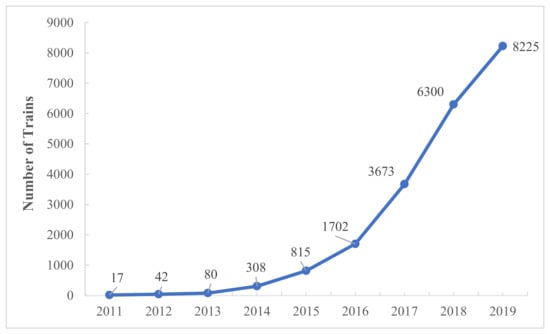 The opening of the China Railway Express (CR Express) is the key element in realizing the facility connectivity and unimpeded trade principles set forth in the OBOR initiative. The first CR Express (Chongqing–Duisburg) successfully opened on 19 March 2011. The CR Express had opened more than 16,000 trains by the end of June 2019, and reaches 53 cities in 16 European countries [14]. The increase in the number of CR Express trains between 2011 and 2019 is shown in Figure 2. In recent years, the service and operation quality of CR Express have been continuously improved, and it has good international brand effect and development prospects. It has effectively pushed China to the world and opened up economic and trade exchanges between countries along the Silk Road Economic Belt. The CR Express has become the iconic achievement of OBOR construction [15].